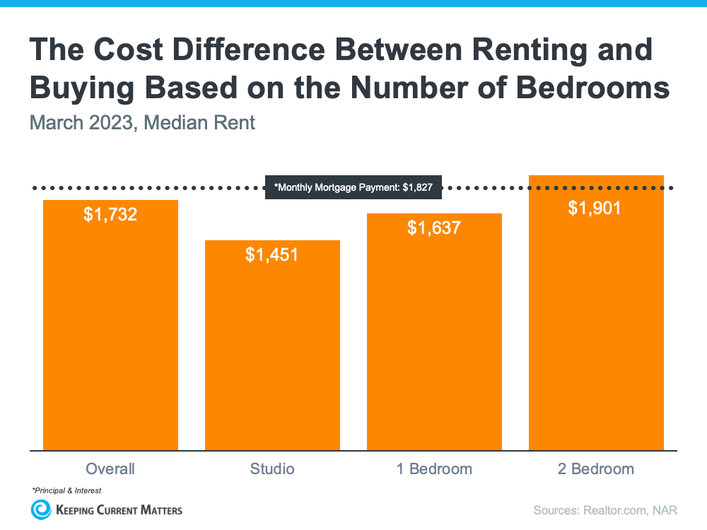 The graph below uses national data on the median rental payment from Realtor.com and median mortgage payment from the National Association of Realtors (NAR) to compare the two options. As the graph shows, depending on how much space you need, it’s typically more affordable to own than to rent if you need two or more bedrooms: